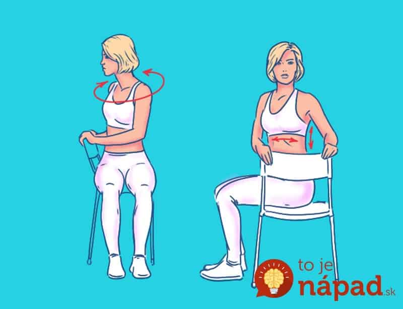 To ćwiczenie zaczynamy od pozycji siedzącej na krześle, jednak bokiem do jego oparcia. Ważne jest, żeby twoje stopy nie wisiały w powietrzu, a opierały się mocno o podłogę. Najpierw ściągnij łopatki, prostując plecy, a następnie odwróć ramiona w bok, zwracając się lewą stroną twarzy w stronę oparcia i opierając dłonie o oparcie krzesła. Pamiętaj, że ruszają się tylko twoje ramiona, reszta ciała jest nieruchoma! W tej pozycji wytrzymaj pół minuty, głęboko oddychając. Ćwiczenie powtórz na drugą stronę. Najlepiej wykonaj po trzy serie na każdą stronę.