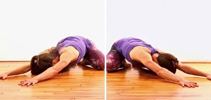 Następnie dłońmi suniemy po podłodze, przesuwając je w prawo, jak najdalej jak potrafimy, tak aby dokładnie poczuć rozciąganie po naszej lewej stronie ciała. Nabieramy parę głębokich i spokojnych oddechów. Następnie ćwiczenie powtarzamy na drugą stronę.