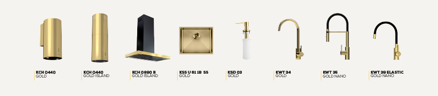 Wchodzące na rynek nowości kuchenne Kernau są zawsze tworzone z głową! To oczywiste że do złotego zlewu potrzebować będziemy pasującej baterii. I tu – w zależności od naszych upodobań – do wyboru mamy aż trzy opcje: w pełni złotą baterię KWT 34 Gold oraz złoto-czarne modele KWT 35 Gold Nano i KWT 39 Elastic Gold Nano, które świetnie prezentować będą się również w zestawieniu z granitowymi zlewami Kernau. Bez względu na to, na który wariant się zdecydujemy, przydatnym uzupełnieniem złotej baterii może być również dozownik do płynu do mycia naczyń KSD 03 Gold ze złotą pompką.