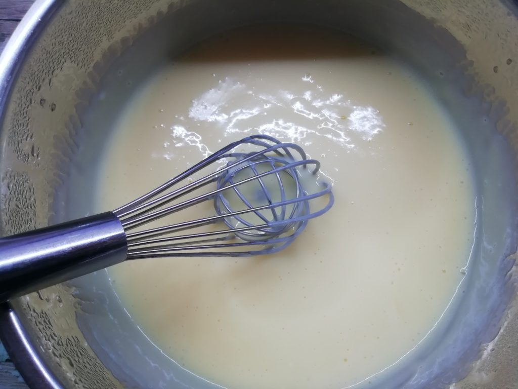 Następnie dodaj cukier waniliowy i skrobię. Wlać część mleka i ubić trzepaczką.