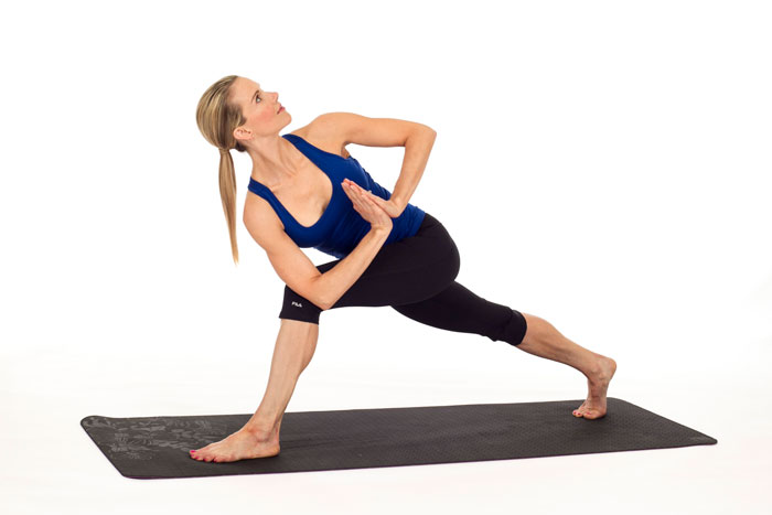 Wykonujemy wypad do jednej z nóg. Następnie, skręcamy tułów w taki sposób, aby dotknąć łokciem kolana.