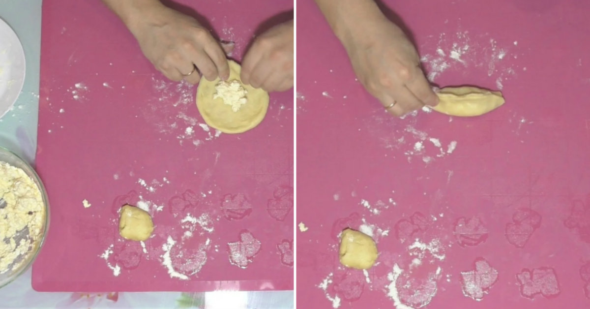Każdy kawałek ciasta wystarczy dokładnie obsypać z każdej strony mąką i rozgnieć ten mały kawałek, żeby uzyskać mniejszy. Na środek każdego z nich wyłożyć porcję nadzienia. Wszystkie rogi ciasta złączyć.