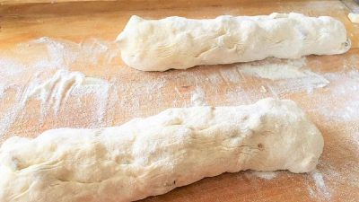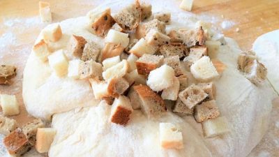 W misce wymieszaj mleko, drożdże i cukier, przykryj miskę czystą ściereczką i pozwól drożdżom wyrosnąć – zajmie to około 15 minut. W drugiej misce wymieszaj mąkę półgrubą, żółtka z solą i drożdże na zakwasie. Całość mieszamy i wyrabiamy ciasto, które pozostawiamy do wyrośnięcia pod czystą ściereczką na 40 minut. Po tym czasie posiekane bułki wmieszać w ciasto i podzielić ciasto na dwie równe części, z których rozwałkować bułki. Zostaw je do wyrośnięcia pod ręcznikiem na kolejne 20 minut.