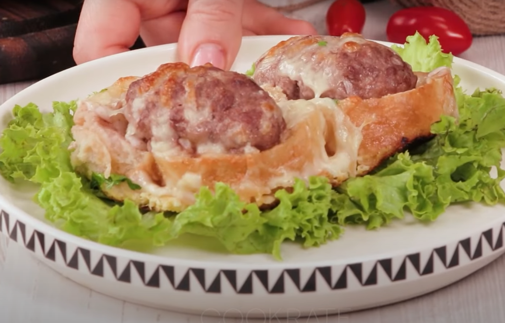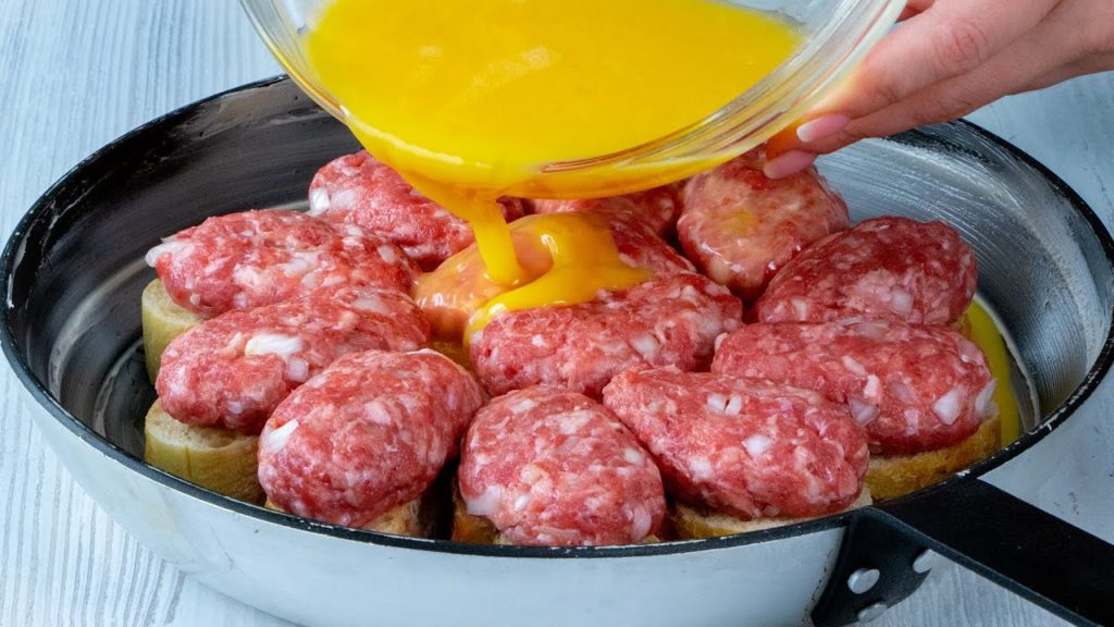 Na każdym kawałku bagietki ułóż jedną mięsną kulkę. Jajka wymieszaj w misce z solą, mlekiem, przeciśniętym przez praskę czosnkiem (opcjonalnie) i wlej do formy do pieczenia.