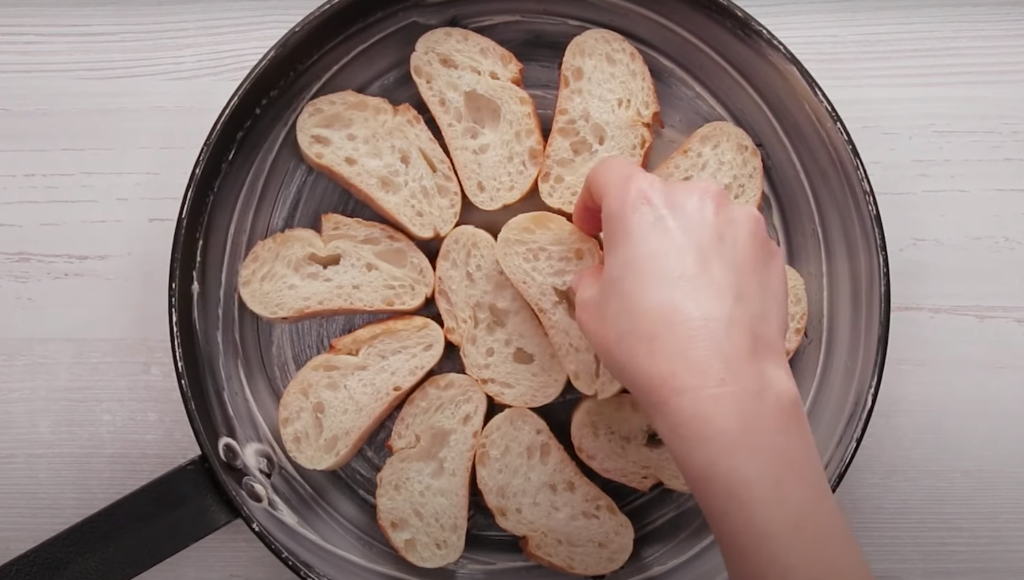 Najpierw pokrój bagietkę i ułóż kromki w posmarowanym masłem naczyniu do pieczenia.