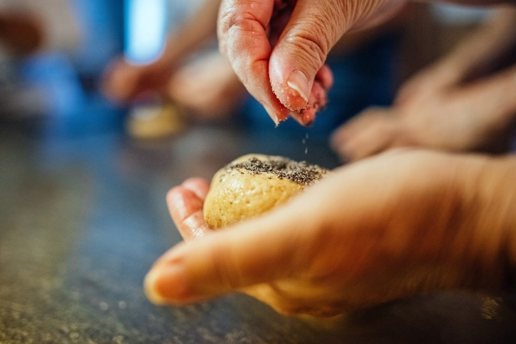 Stopniowo przesiewaj mąkę przez sito, mieszając z mokrymi składnikami. Wyrób ciasto rękoma, aby uzyskać gładką konsystencję. Przykryj ciasto folią i odstaw na 1 godzinę do wyrośnięcia w ciepłym miejscu.