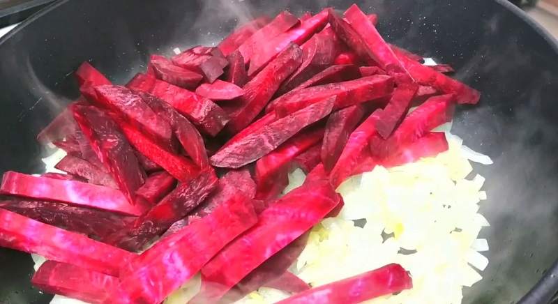 Buraki pokrój w cienkie plasterki, obierając je. Na oleju podsmaż posiekaną i obraną cebulę. Dodaj paski buraków. Często mieszaj i smaż przez 10 minut na małym ogniu. Dodać śmietanę, ząbki czosnku przeciśnięte przez praskę i sól do smaku.