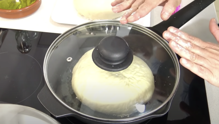 Po tym czasie należy przygotować patelnię. Rozgrzać olej i włożyć jedną część ciasta. Należy ją piec z jednej strony przez ok.12-15 minut, pod przykryciem.