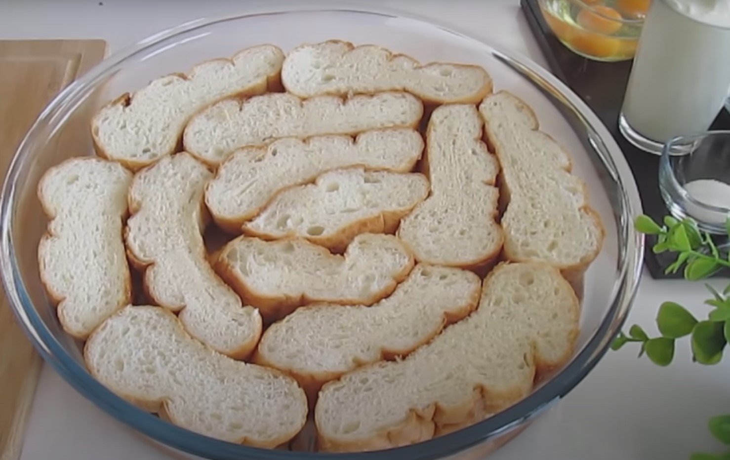 Cały chleb pokrój w paski o wielkości około 2 cm i umieść na dnie naczynia żaroodpornego, tak aby całe dno było wypełnione.