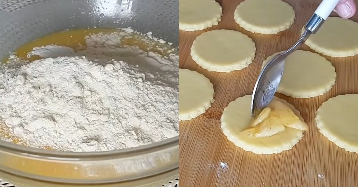 Następnie dodajemy proszek do pieczenia i ciągle mieszając stopniowo dodajemy mąkę. Ciasto należy zagnieść na jednolitą masę. Ciasto należy rozwałkować na warstwę i wyciąć z niego kółka, podobne jak do robienia pierogów. Następnie na każdym kółku należy rozłożyć nadzienie i złożyć krążek na pół, jak książkę.