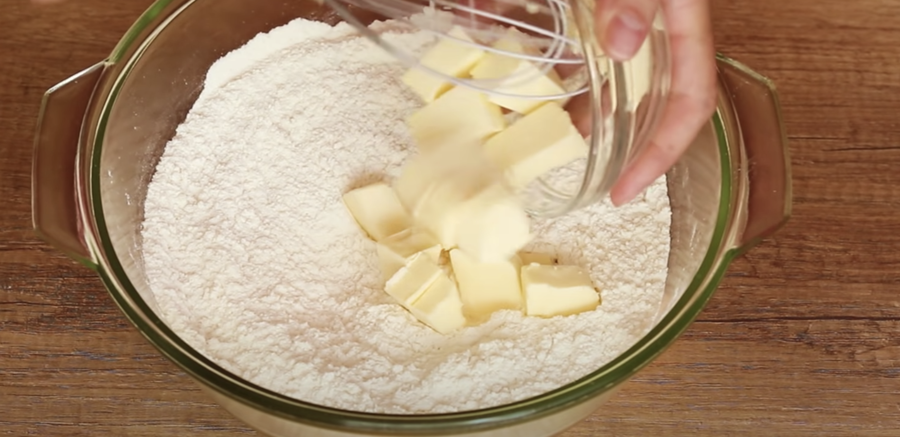 Mąkę przesiej i wymieszaj z proszkiem do pieczenia. Dodaj kawałki zimnego masła i utwórz kruchą mieszankę.