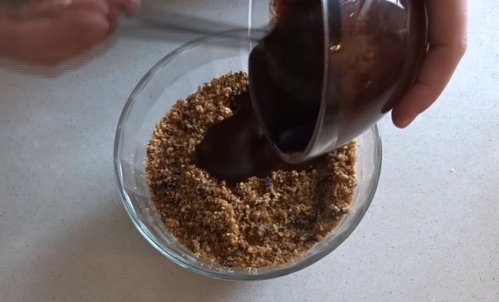 Herbatniki zblenduj drobno z orzechami oraz bakaliami. 70g masła i 70g czekolady rozpuść razem w kąpieli wodnej bądź mikrofali, po rozpuszczeniu dokładnie wymieszaj do powstania jednolitej masy.