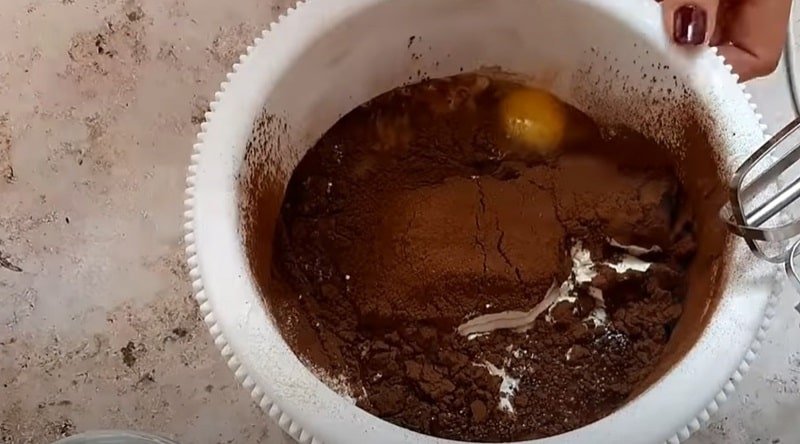 Pierwszy krok to przesianie mąki i kakao do dużej miski, potem dodaj cukier, jajka i mleko.
