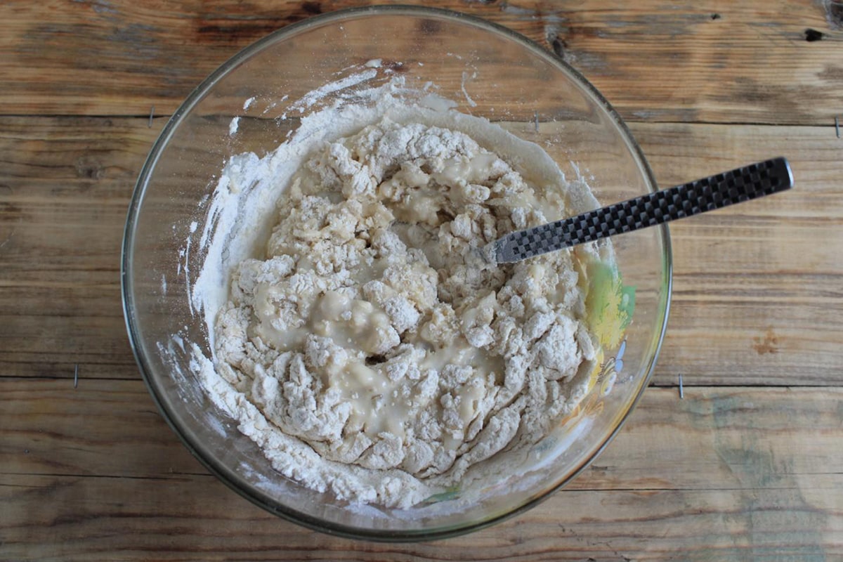 Wymieszaj wszystko do uzyskania gładkiego ciasta. Dodawaj mąkę porcjami, ciągle mieszając.
