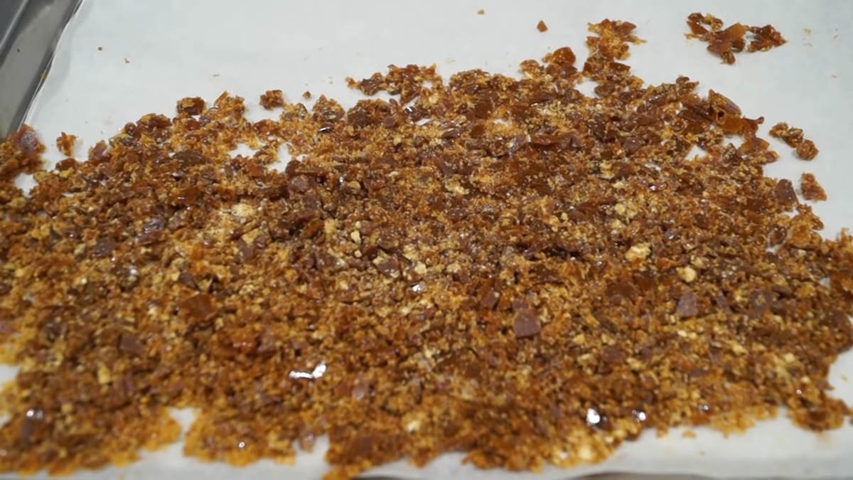 Masło kroimy na kawałki i dodajemy do przygotowanej wyżej masy. W rondelku rozpuszczamy cukier i poddajemy go procesowi karmelizacji. Po rozpuszczeniu wylewamy masę na pergamin i przykrywamy następnym kawałkiem. Cukier miażdżymy wałkiem na drobne kawałki.