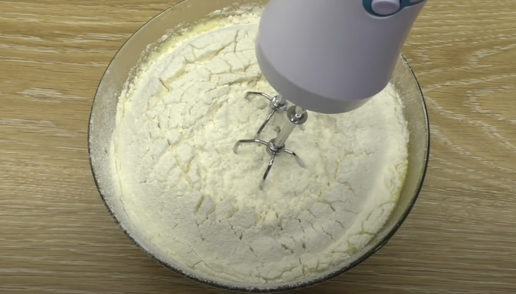Na koniec wsyp przesianą mąkę zmieszaną z proszkiem do pieczenia i zagnieść ciasto do uzyskania jednolitej konsystencji.
