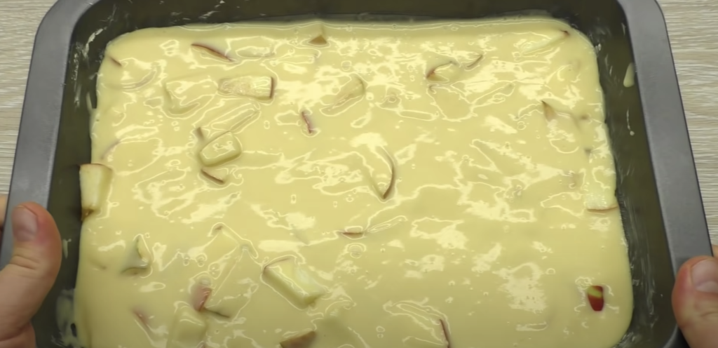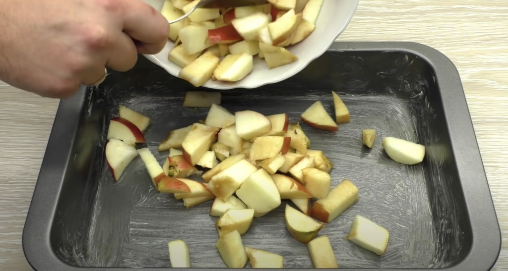 Układanie Szarlotki: Przenieś jabłka do formy o wymiarach 21×31 cm, wcześniej wysmarowanej masłem. Następnie przykryj je ciastem, wyrównując powierzchnię.
