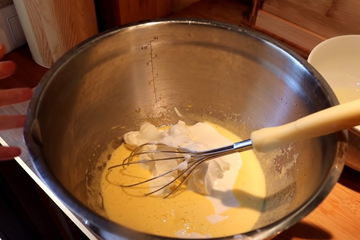 Ubijamy białka na sztywną pianę, dodajemy odrobinę soku z cytryny lub też kwasku cytrynowego. Powstałą pianę dodajemy do żółtek z jogurtem i mieszamy za pomocą trzepaczki.