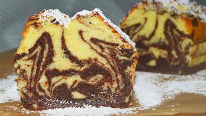 Ciasto podzielić na dwie miski. Do jednej dodać kolejne trzy łyżki mąki półgrubej, a do drugiej trzy łyżki kakao. Formę do ciasta smarujemy olejem, posypujemy grubą mąką lub bułką tartą i wlewamy najpierw jasne, a następnie ciemne ciasto. Następnie delikatnie wymieszaj oba ciasta widelcem, aby w środku powstała marmurkowatość. Ciasto wkładamy do piekarnika nagrzanego do 180°C i pieczemy około 40 minut. Gotowe ciasto posyp cukrem pudrem i podawaj.