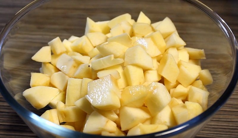 Piekarnik rozgrzewamy do 180 stopni. Jabłka obieramy, następnie usuwamy gniazda nasienne i kroimy w kostkę średniej wielości. Przekładamy je do dużej miski i polewamy sokiem z cytryny oraz mieszamy.