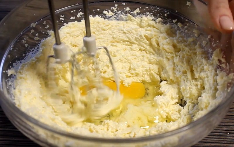 Kolejny krok to przygotowanie ciasta. Łączymy miękkie masło z cukrem i dodajemy niedużą ilość cukru pudru. Dosypujemy do mieszanki sól i dokładnie mieszamy. Jajka rozbijamy i dodajemy do mieszanki na ciasto. Miksujemy do uzyskania gładkiej masy.