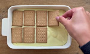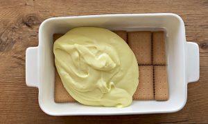 Ułóż ciągłą warstwę prostokątnych ciastek w prostokątnej blasze lub naczyniu do pieczenia o wymiarach 20 x 14 cm i wylej na nią przygotowaną masę budyniową. Rozprowadź go równą warstwą i wyrównaj powierzchnię do gładkiej płaszczyzny. Następnie ułożyć na nim drugą warstwę ciasteczek.