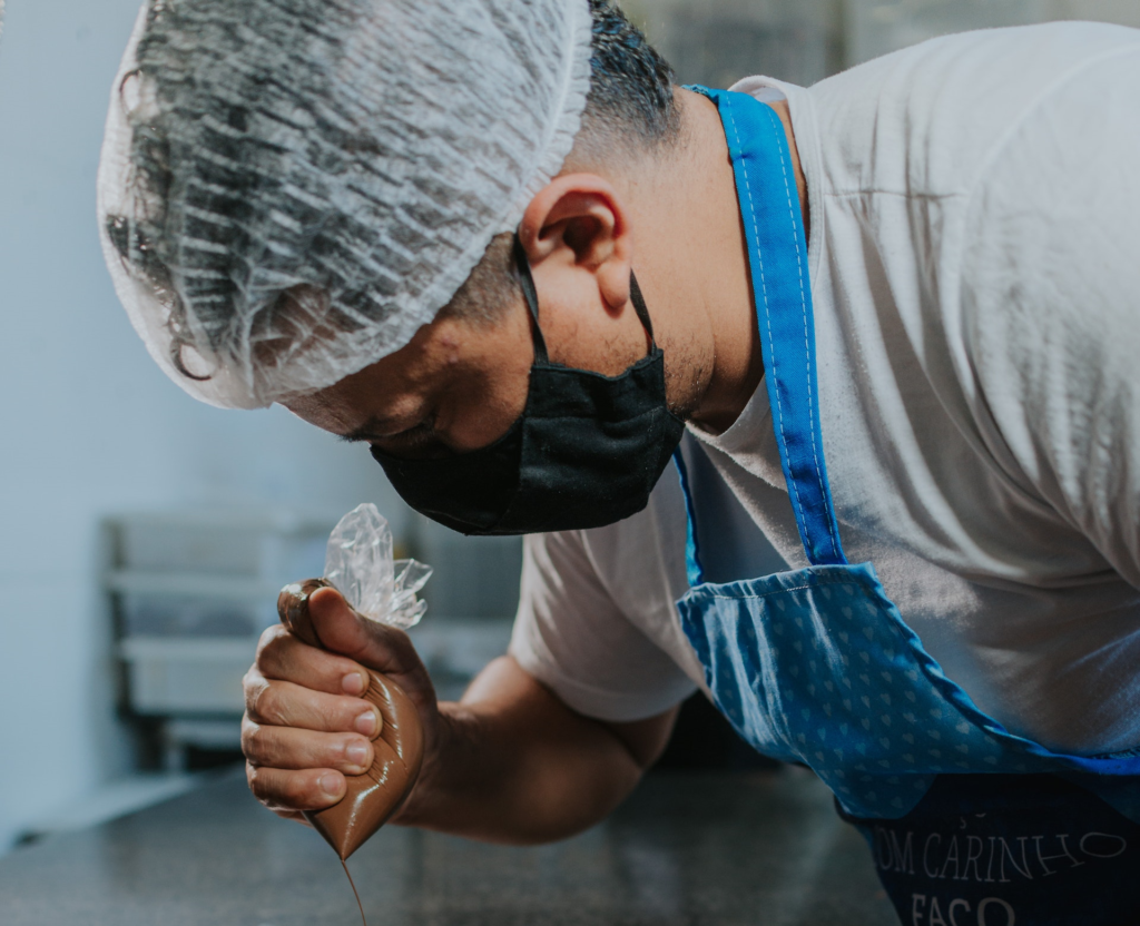 Lukier nakładamy na ciasto za pomocą rękawa cukierniczego. Pozwól czekoladzie stwardnieć i podawaj.