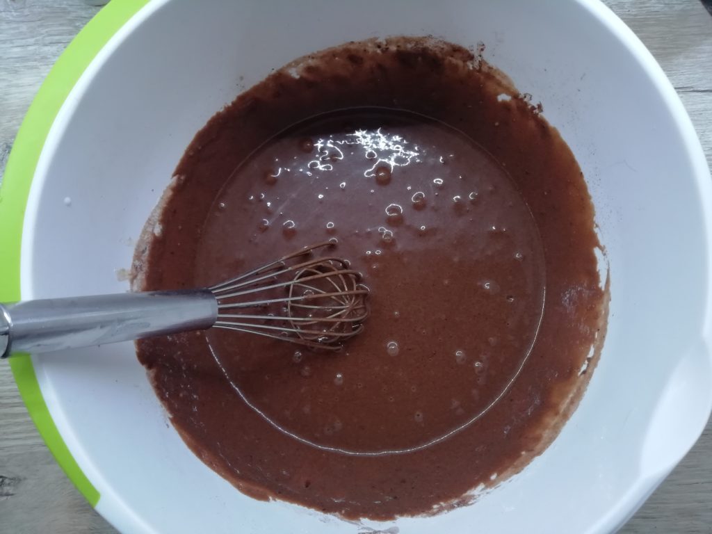 Dodać jajka, sól i wymieszać trzepaczką. Następnie dodać kakao, proszek do pieczenia i ponownie wymieszać.