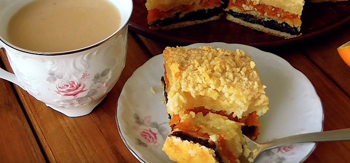 Posyp wiersz odstawionymi wcześniej kawałkami kruszonki z mąki i masła. Ciasto włóż do rozgrzanego piekarnika i piecz przez około 45 do 50 minut.