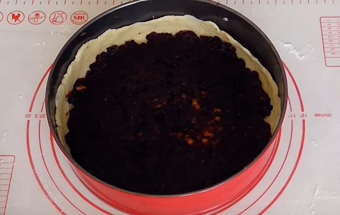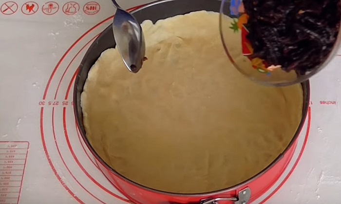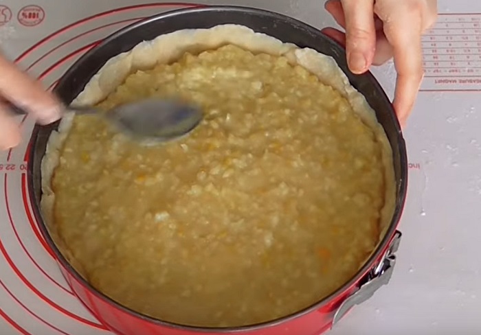 Formę do pieczenia wyłóż papierem lub pergaminem, albo wysmaruj masłem. Największą część ciasta rozwałkuj i ułóż na dnie formy, tak aby ciasto zachodziło na boki.