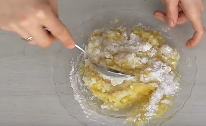 Cytrynę podziel na ćwiartki i przemiel w maszynce do mielenia lub blenderze. Dodaj cukier i mąkę. Dokładnie wymieszaj do połączenia się składników