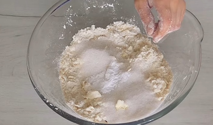 Do pierwszej części ciasta dodaj cukier i proszek do pieczenia, dosyp też szczyptę soli. Dokładnie wymieszaj.
