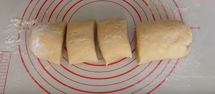 Powoli wlewaj mleko i dobrze zagnieć ciasto do uzyskania kulki. Ciasto na posypanym mąką blacie uformuj w rulon i podziel na 3 równe i jedną nieco większą część. Pozostaw na chwilę do połączenia na blaszce z nadzieniem.