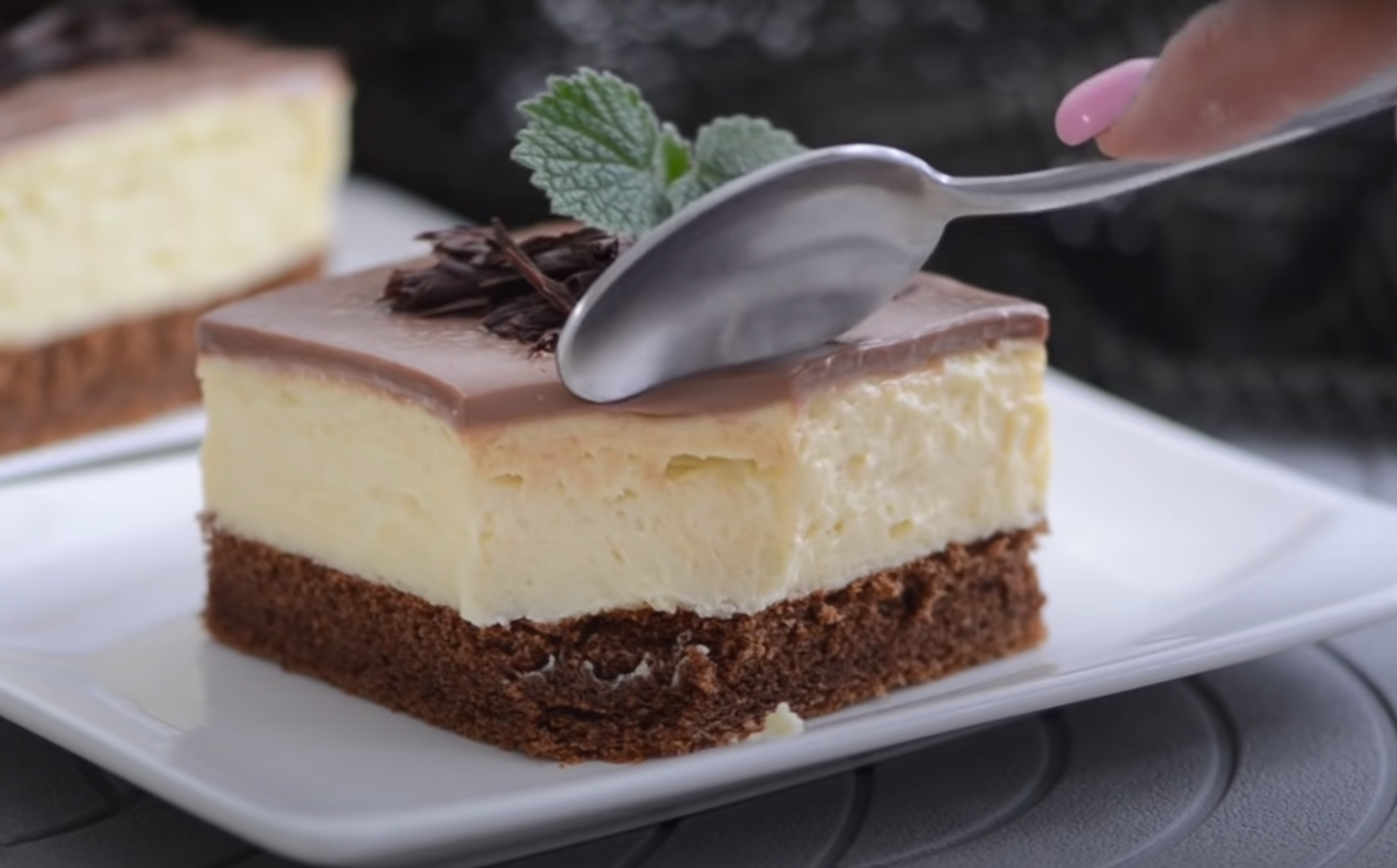 Polewę wylej na krem i ciasto włóż do lodówki, aby zastygła. Jeśli chcesz, możesz udekorować porcję ciasta startą czekoladą i listkami mięty. Smacznego!
