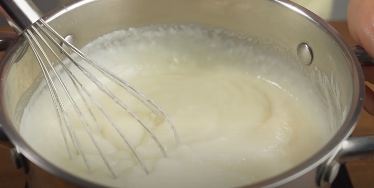 W tym czasie umieść w garnku mleko, dodaj 170 g cukru, kaszę mannę, wiórki kokosowe oraz cukier waniliowy i dokładnie rozmieszaj. Ponownie gotuj na małym ogniu, ciągle mieszając, przez około 1 minutę.
