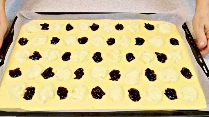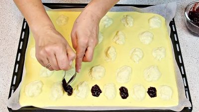 Powstałe ciasto wylewamy na blachę o wymiarach 30×40 cm pokrytą papierem do pieczenia i zaczynamy dekorować. Za pomocą łyżki odrywaj kawałki masy kremowej i układaj je w stosy na powierzchni ciasta w równych odległościach od siebie. W przestrzeniach pomiędzy kopczykami z kremem formujemy kopytka z konfiturą i pieczemy ciasto w piekarniku nagrzanym do 180°C przez około 40 minut. Po upieczeniu wyjąć z blachy na metalową kratkę wyłożoną papierem do pieczenia i pozostawić do powolnego ostygnięcia.
