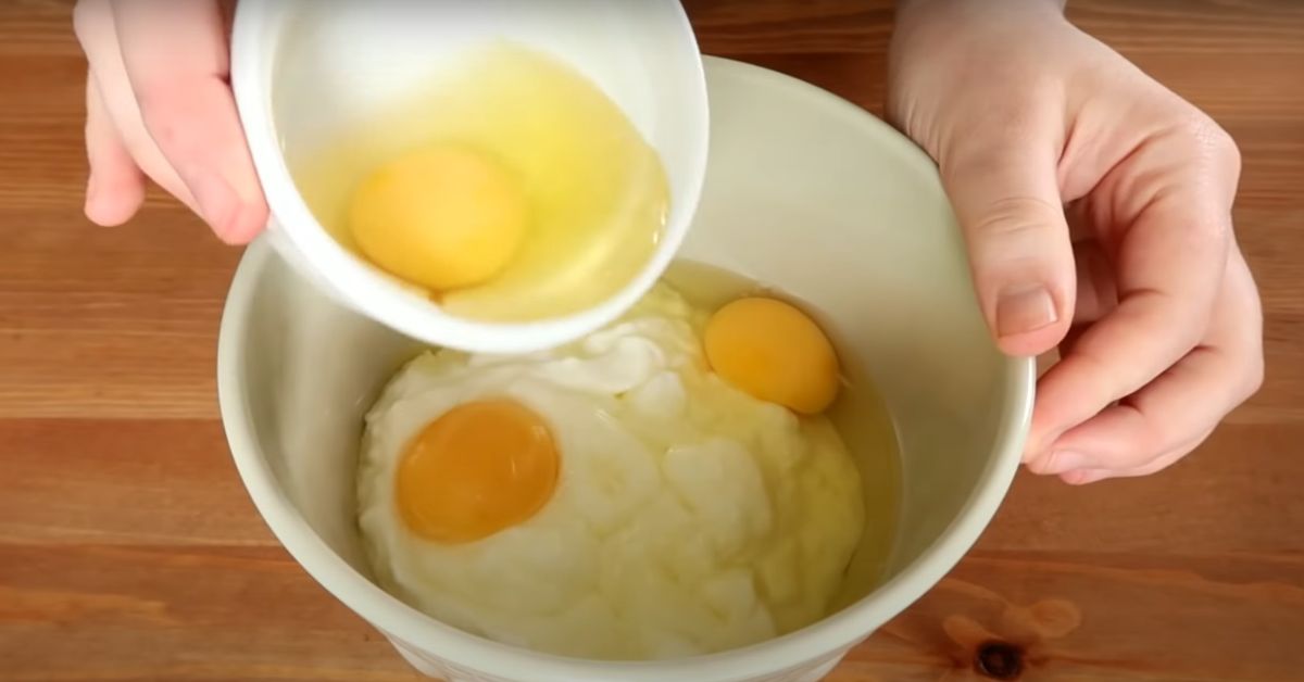 Przygotuj miskę, do której należy wlać jogurt. Następnie wbijamy jajka i ubijamy całość, aż do uzyskania gładkiej masy. Później przesiewamy skrobię ziemniaczaną i dokładnie mieszamy.
