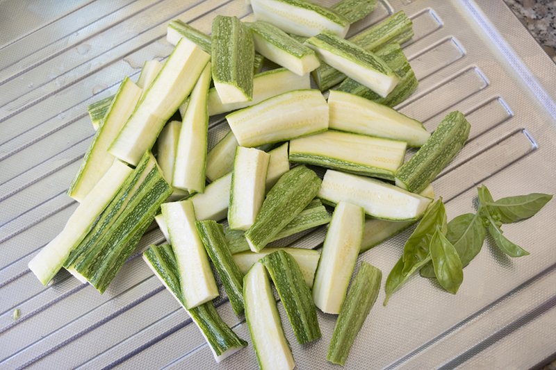 Umyj słoiki sodą oczyszczoną i dobrze wypłucz pod bieżącą wodą. Umytą młodą cukinię pokrój w plastry o długości około 8 cm.