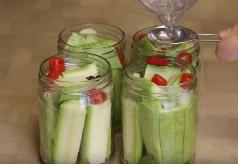 Cukinię ułóż możliwie jak najciaśniej w słoikach. Zalej wrzątkiem i odstaw na 10 minut.