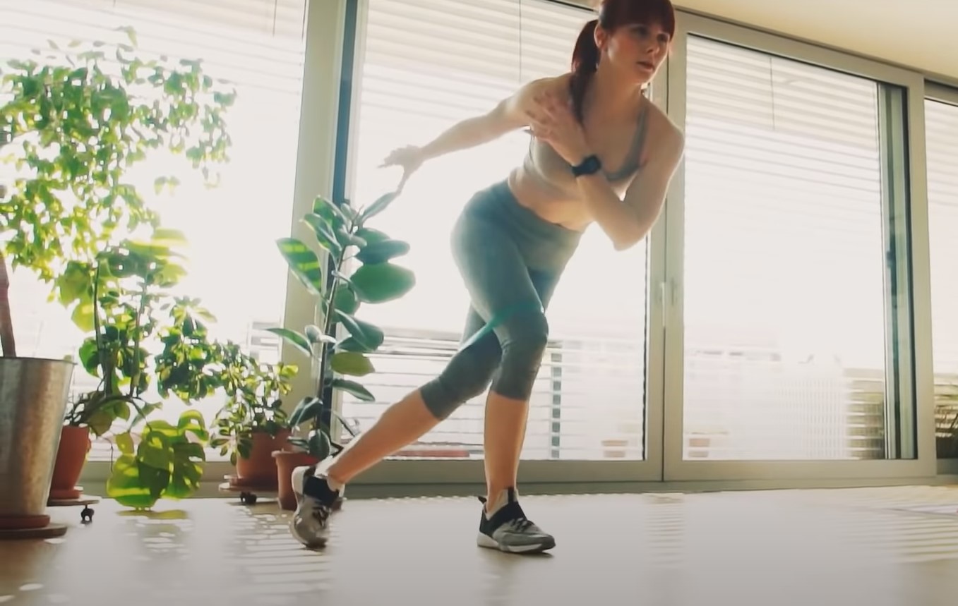 Przeskoki skrzyżne z jednej nogi na drugą z jednoczesnym dotykaniem rękoma ramion, naprzemiennie. To ćwiczenie, które nie tylko pomaga wyrobić biodra, ale też spala kalorie, przez co pomaga w odchudzaniu, warto pamiętać o utrzymaniu prostych pleców. Ćwiczenie będzie jeszcze efektywniejsze, gdy użyje się do niego gum.