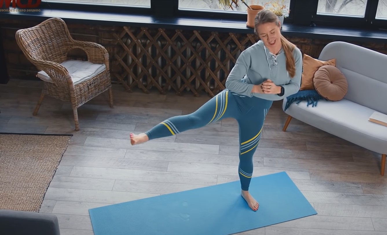 Wariacja klasycznego przykładu, czyli przysiad z kopnięciem w bok. Ćwiczenie angażuje wiele partii mięśniowych, dzięki czemu pozwala szybko ujędrnić okolice bioder. Ćwiczenie warto powtarzać przez 30 sekund.