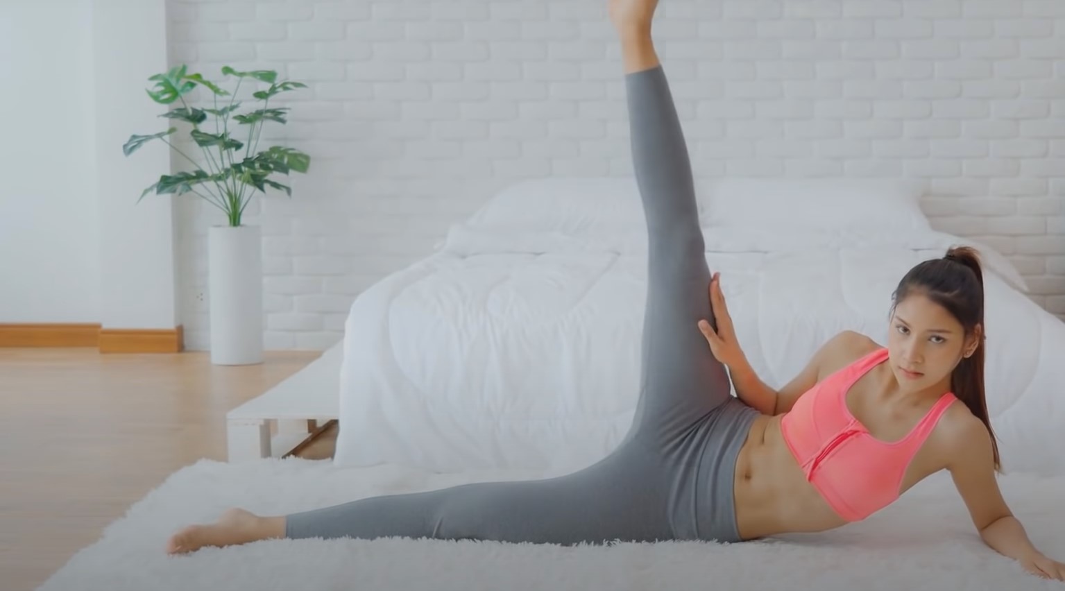 Leżąc na boku z prostymi nogami, należy jedną nogę podnosić do góry i opuszczać na dół przez 30 sekund, a następnie to samo powtórzyć na drugą stronę.