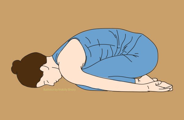 Usiądź na zgiętych kolanach, opierając pośladki o stopy. Pochyl się do przodu, tak aby klatka piersiowa przyległa do Twoich ud.
