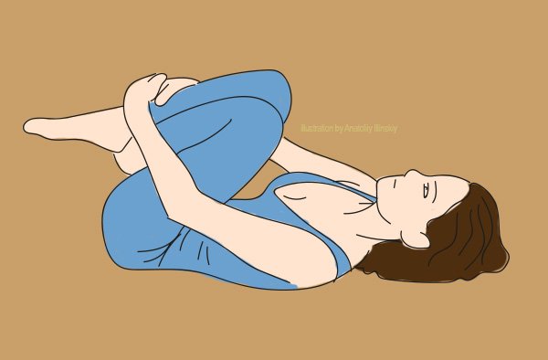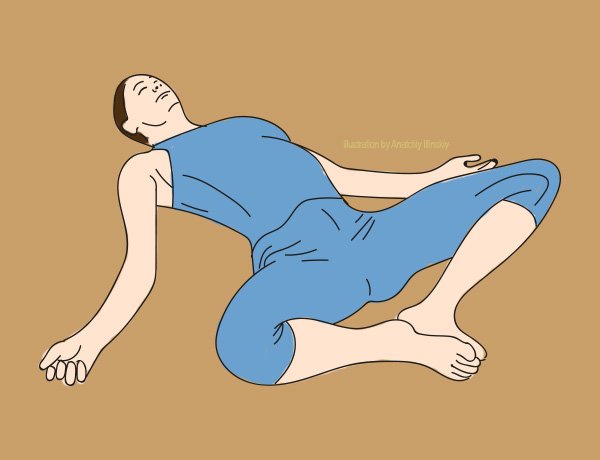 Chociaż to ćwiczenie jest podobne do pozycji bocznej bezpiecznej, nie powinno być wykonywane z wyciągniętymi rękami. W tym ćwiczeniu należy położyć się na plecach i przełożyć jedną nogę nad drugą. Następnie przyciągamy kolana do klatki piersiowej.