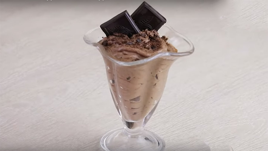 Wyjmij miskę ze schłodzoną śmietaną z lodówki i za pomocą miksera elektrycznego ubij ją na gęstą pianę, która po wyjęciu trzepaczek pozostawia miękkie szczyty. Następnie stopniowo do ubitej piany dodajemy masę czekoladową i dalej ubijamy na najniższych obrotach. Po dodaniu całej masy czekoladowej do ubitej śmietany, przełóż mus do rękawa cukierniczego i napełnij nim musem pucharki, a następnie udekoruj powierzchnię kawałkiem czekolady lub startymi płatkami czekolady.
