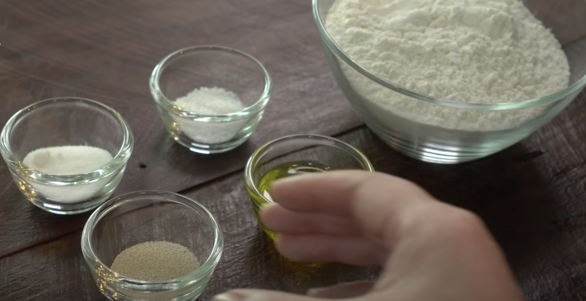 Wymieszaj cukier, drożdże i ciepłą wodę. Mąkę wymieszaj z solą i dodaj drożdże. Rozpocznij wyrabianie ciasta – dodawaj małym strumieniem olej. Wyrób jednolite ciasto, przykryj folią i odstaw w ciepłe miejsce.