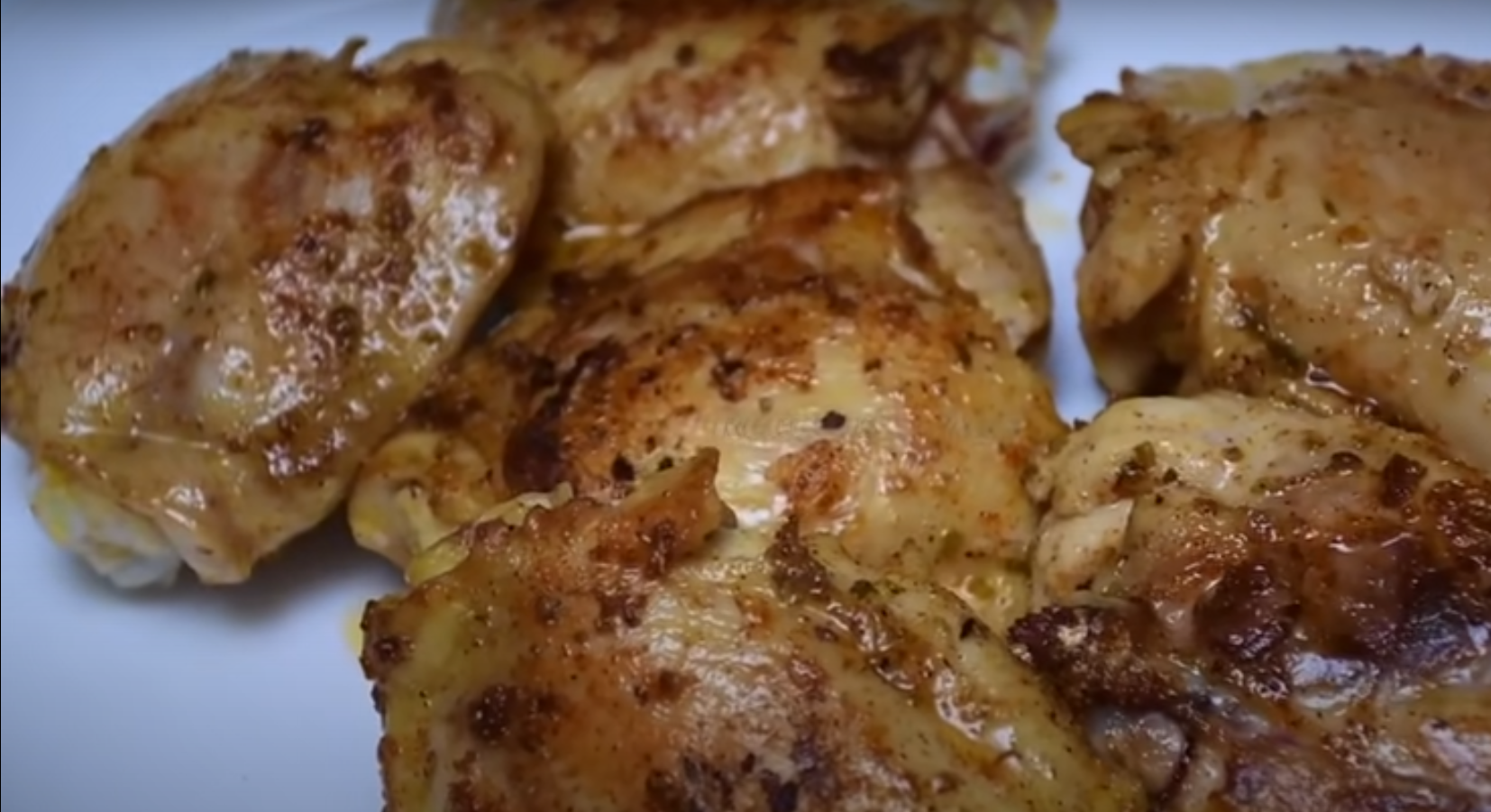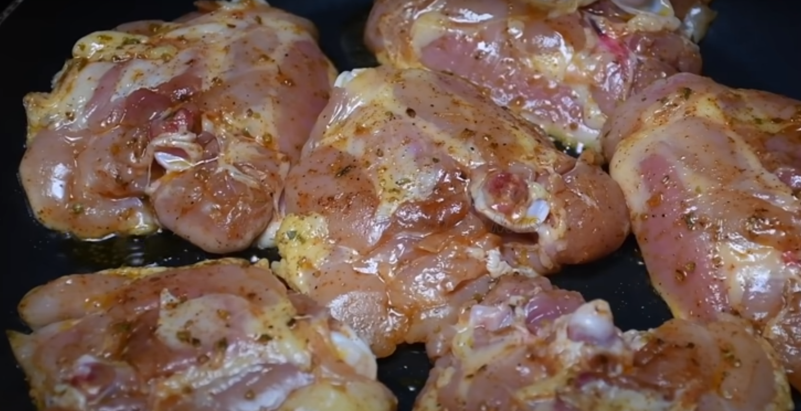 Zdejmij skórę z ud kurczaka, umyj i osusz papierowym ręcznikiem. Przyprawy i oliwę wymieszaj w małej miseczce. Natrzyj mięso przygotowaną marynatą. Podgrzej patelnię i ułóż na niej przygotowane mięso. Smaż na średnim ogniu przez 5 – 7 minut, a w międzyczasie przygotuj sos.