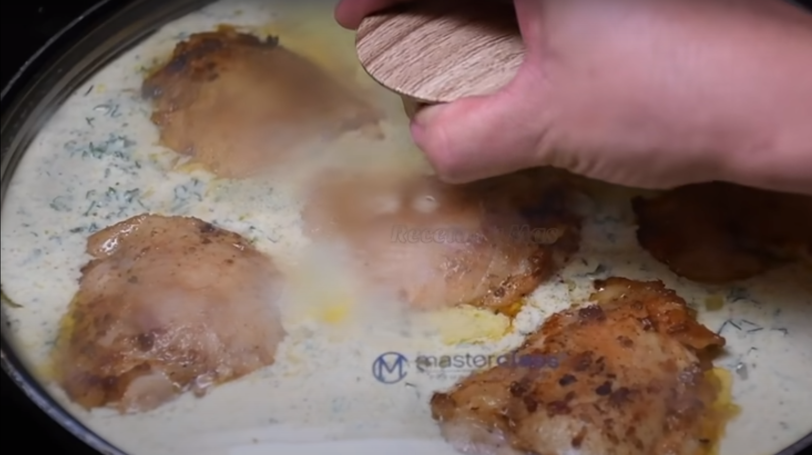 Na patelnię włóż teraz masło, rozpuść, dodaj pokrojoną w plasterki cebulę, zmiażdżony czosnek i chwilę podsmaż, ciągle mieszając. Teraz wlej śmietanową mieszankę na patelnię. Następnie dodaj posiekane zioła. Wsyp parmezan i jeszcze raz dokładnie wymieszaj. Teraz włóż ponownie mięso na patelnię, przykryj pokrywką i gotuj na wolnym ogniu przez około 20 minut.