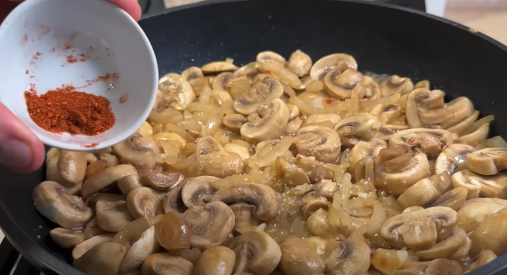 Dodaj do patelni z cebulą i czosnkiem grzyby. Dopraw szczyptą soli, 1/2 łyżeczki ostrej papryki i 1 łyżeczką papryki. Wlej 2 łyżki sosu sojowego i dobrze wymieszaj. Dodaj usmażoną cukinię do patelni z grzybami i cebulą. Wszystko razem dokładnie wymieszaj i smaż przez kilka minut, aby smaki się połączyły. Posyp danie startym parmezanem i posiekaną pietruszką.