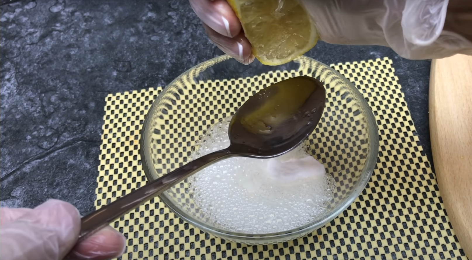 Wsyp sodę oczyszczoną do miski i wlej sok z cytryny. Mieszaj tak długo, aż mikstura zacznie się pienić.